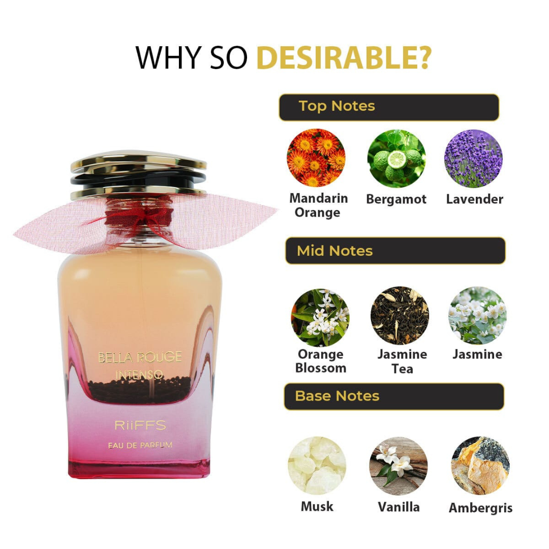 Bella Rouge Intenso by Riiffs Perfumes is a Floral fragrance for women. Bella Rouge Intenso was launched in 2020. Top notes are Peach Blossom, Neroli and Rind Bergamot; middle notes are Honeysuckle, Jasmine Tea and Orange Blossom; base notes are Vanilla Bean, Cedar and Musk.